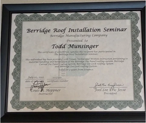 Berridge Roof Installation Seminar Certificate